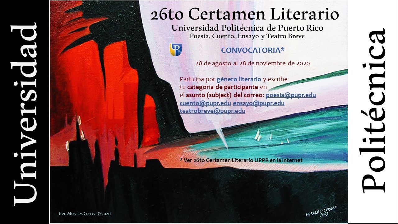 Invitamos a toda la comunidad universitaria a participar de nuestro Certamen en las categorías de: Estudiante de la Universidad Politécnica de Puerto Rico, o en la de Miembro de la Comunidad. Como todos los años, el Certamen tiene otras dos categorías: Estudiante de Escuela Superior y Estudiantes de Otras Universidades. Esperamos su participación en los géneros de poesía, cuento, ensayo y teatro breve.