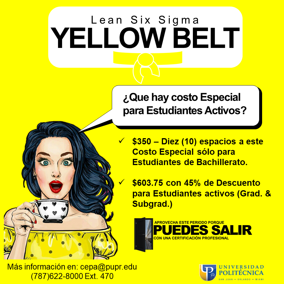 La Universidad Politécnica de PR le provee a sus estudiantes las herramientas para que puedan obtener una certificación profesional de pertinencia y relevancia laboral. La estructura de costos para el curso de certificación Lean Six Sigma Yellow Belt tiene los siguientes costos especiales y descuentos: