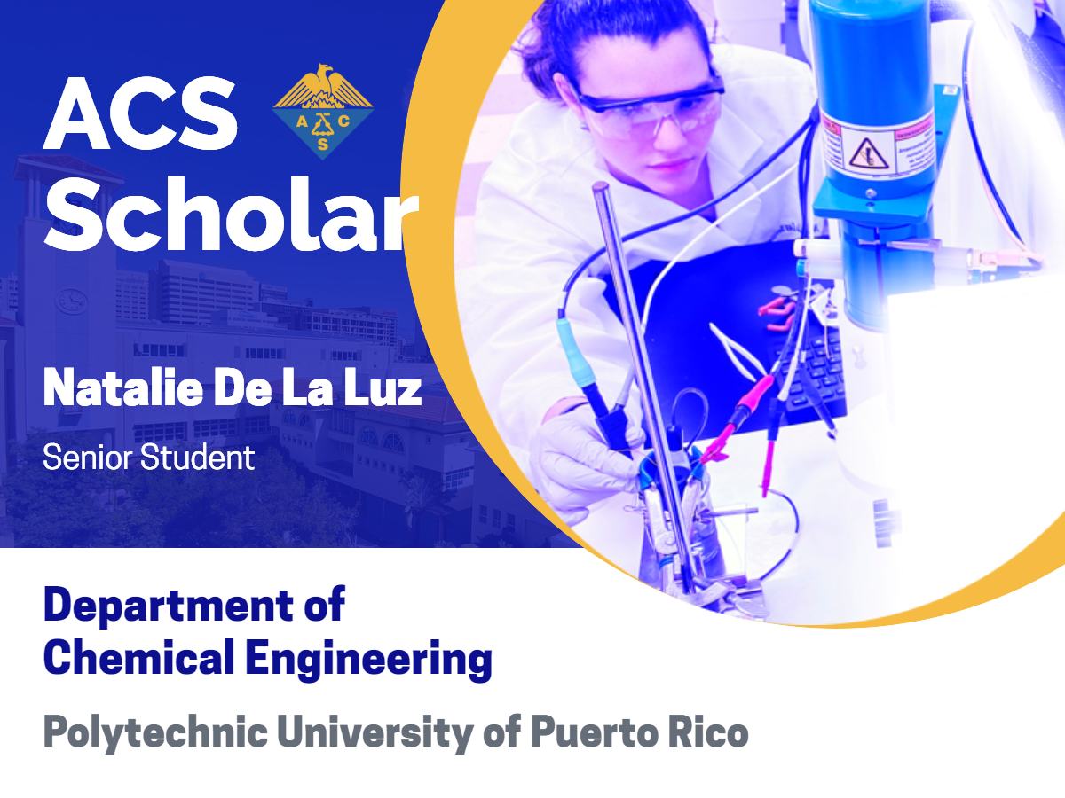 Natalie A. De La Luz y Shakira M. Martínez, dos estudiantes de último año de ingeniería química de nuestra institución fueron seleccionadas recientemente como becarias por parte de la Sociedad Americana de Química (ACS, por sus siglas en inglés). Las estudiantes forman parte de un selecto grupo de cien estudiantes procedentes de diferentes estados y territorios de la nación americana que estudian carreras relacionadas con la química. Estos estudiantes fueron seleccionados teniendo en cuenta su desempeño académico, cualidades de liderazgo, planes profesionales futuros y compromiso social. Como parte de los beneficios de este programa de ACS, ambas estudiantes recibirán apoyo económico para sufragar gran parte de los gastos de su matrícula hasta que culminen sus estudios universitarios.