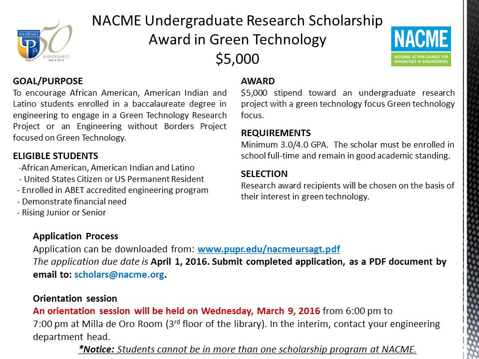NACME Undergraduate Research Scholarship Award in Green Technology