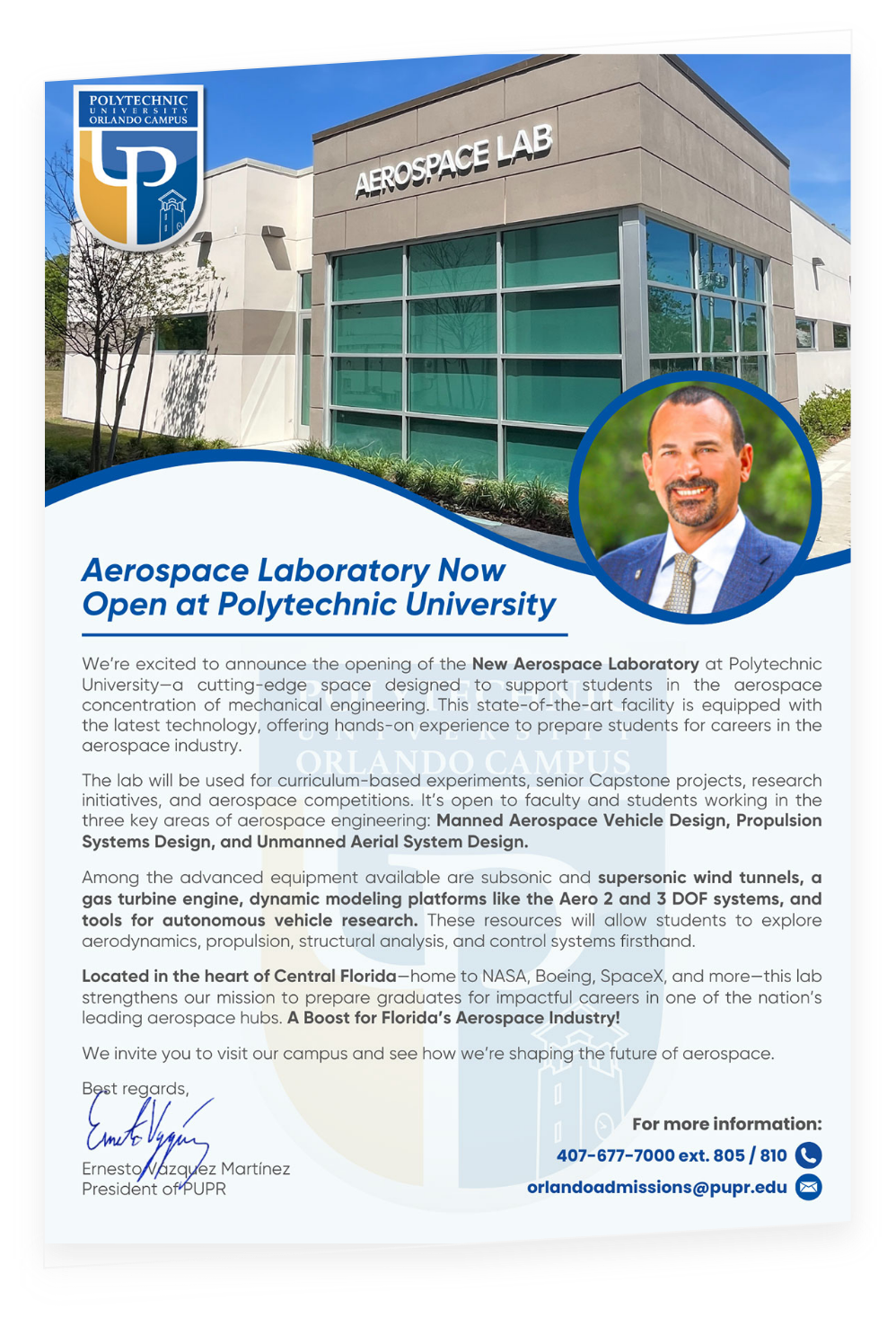 Polytechnic University of Puerto Rico – Orlando Campus proudly announces the upcoming inauguration of its new Aerospace Laboratory, a 4,000-square-foot, state-of-the-art facility created to empower students in the aerospace concentration of the Mechanical Engineering program.